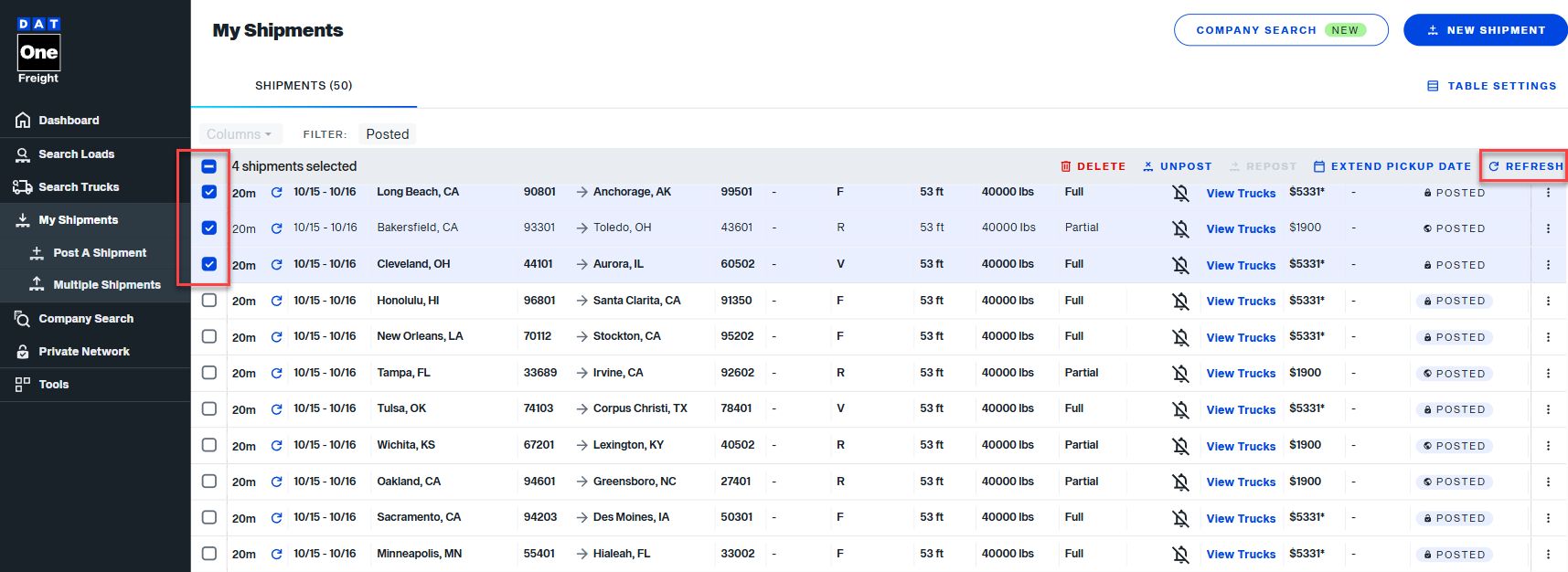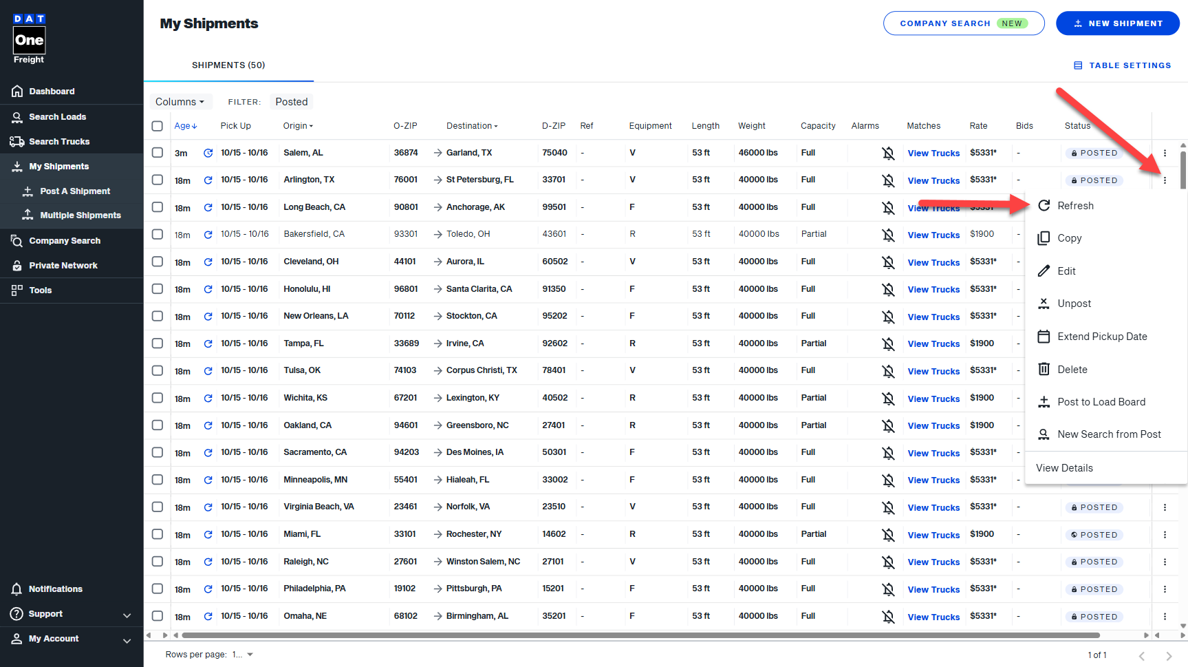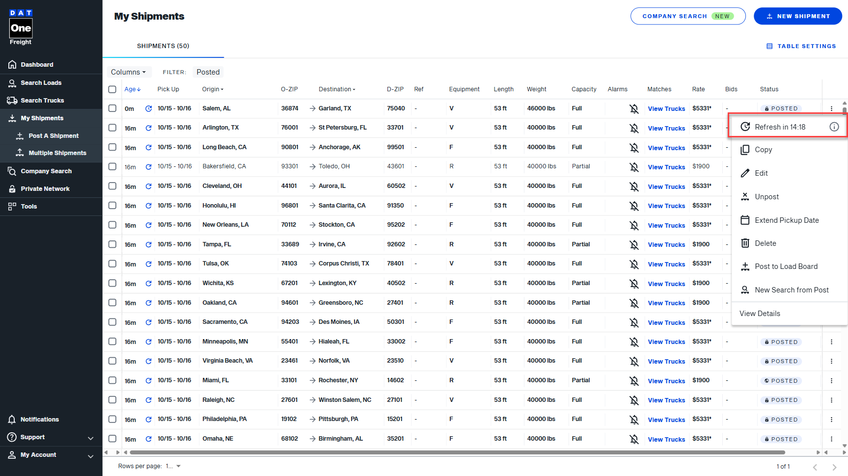 To ensure your shipment stays visible at the top of the carrier's search results, it's important to refresh it regularly. With DAT One web, you can refresh your shipment every 15 minutes to maximize its exposure.
