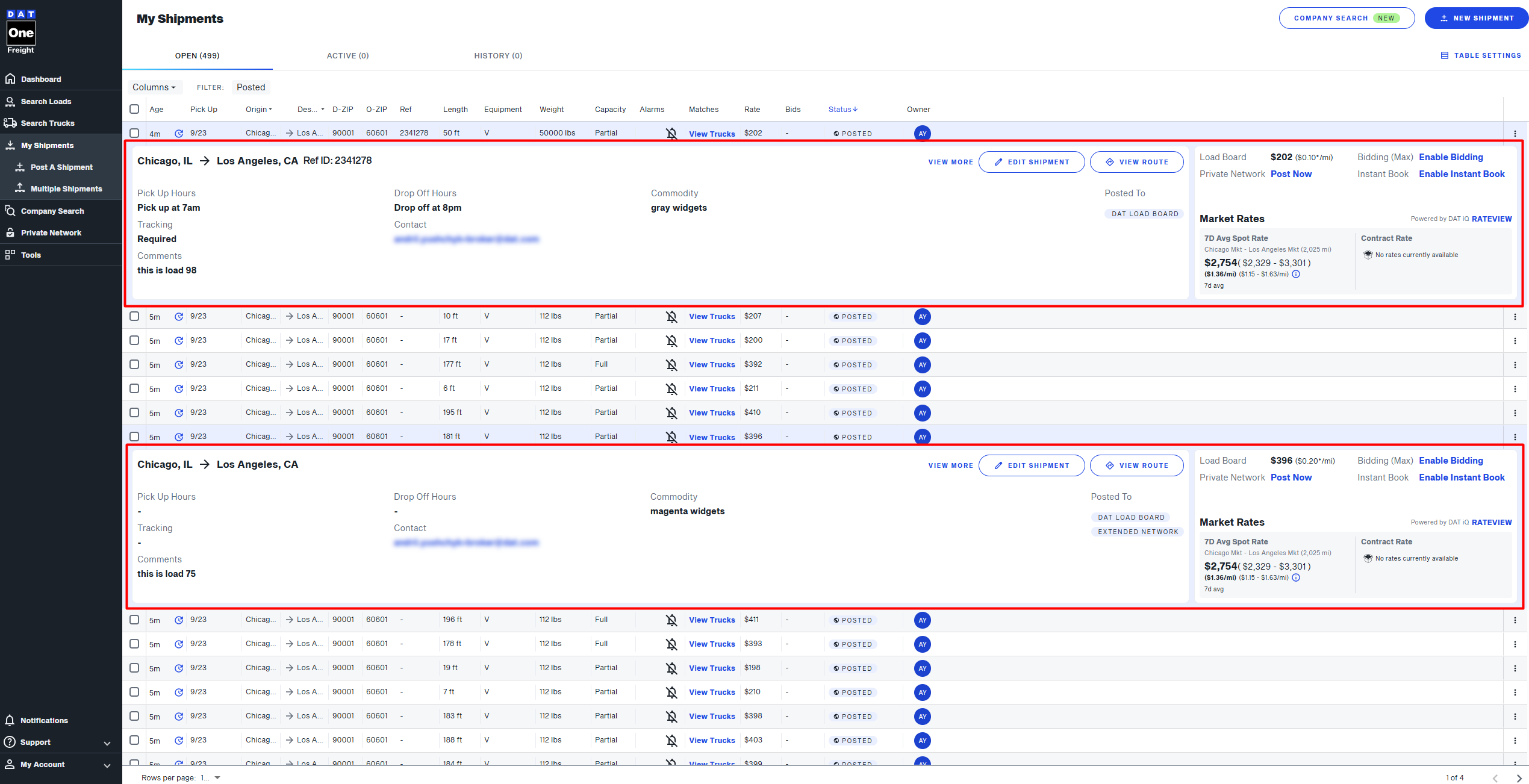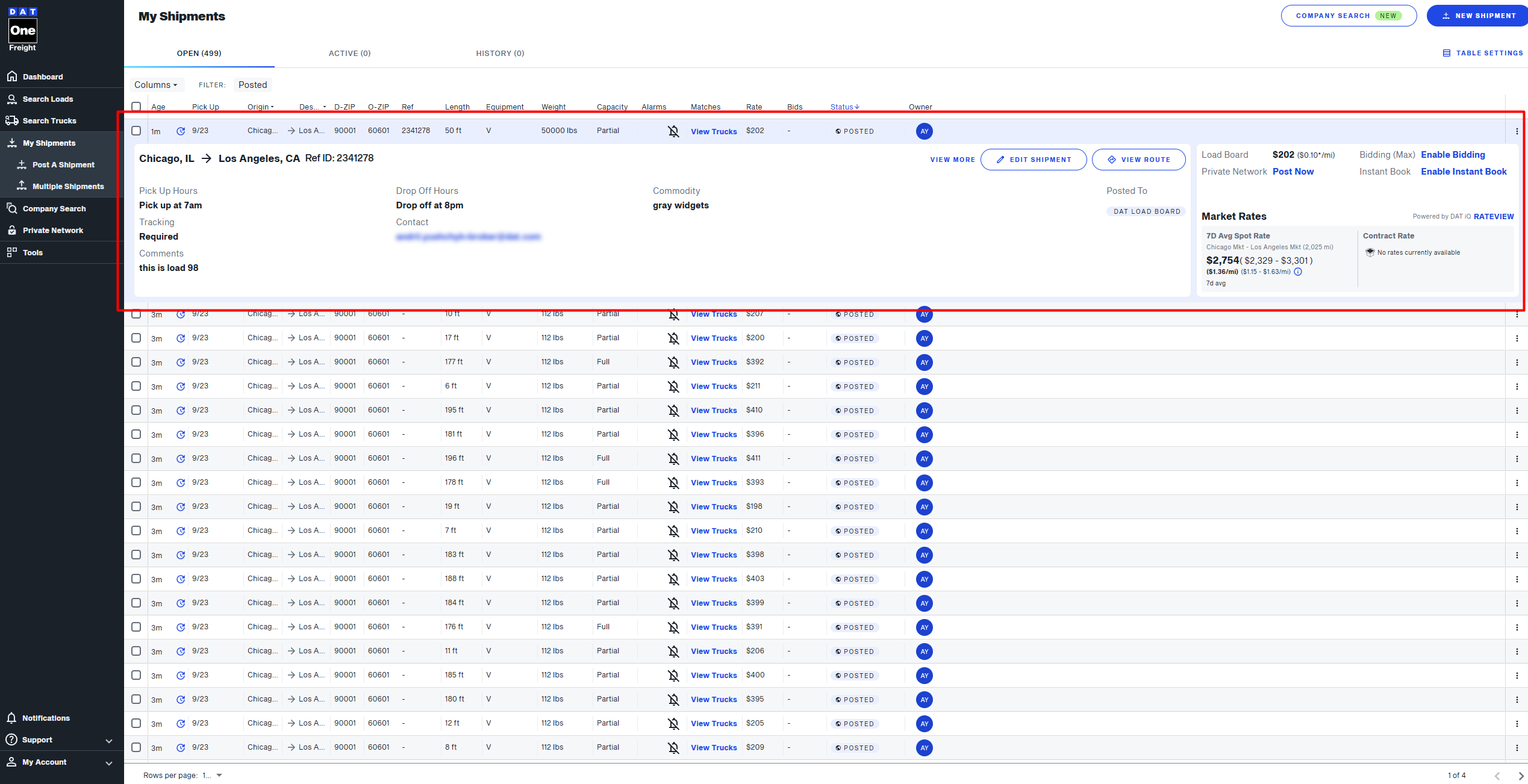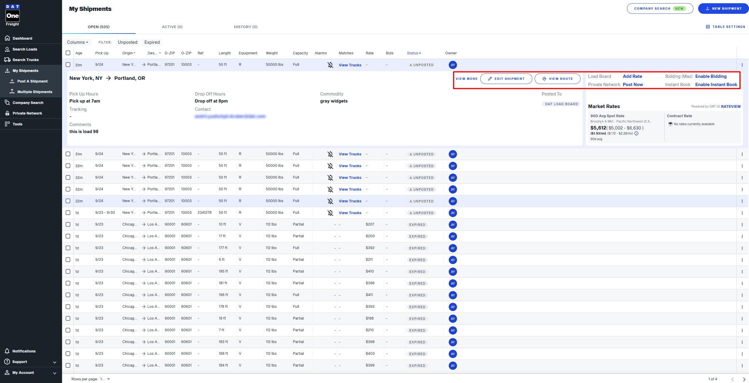 From the expanded view, you can take quick actions such as opening full shipment details, viewing the route on a map, editing the shipment, adding a rate, posting the load, enabling bidding, or turning on instant book. This lets you manage shipments more efficiently and without losing your place.
