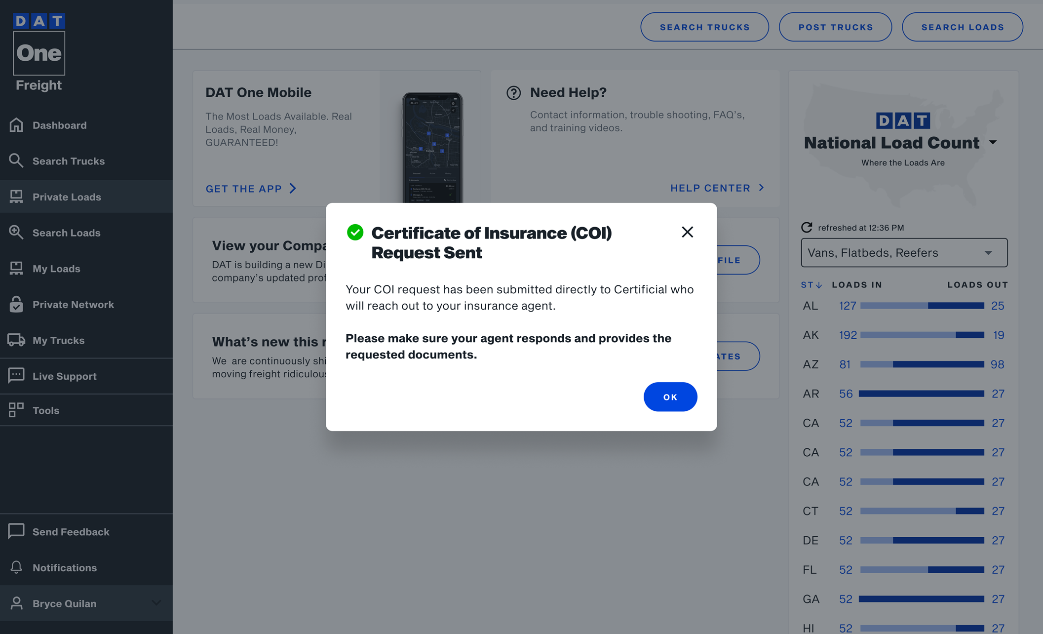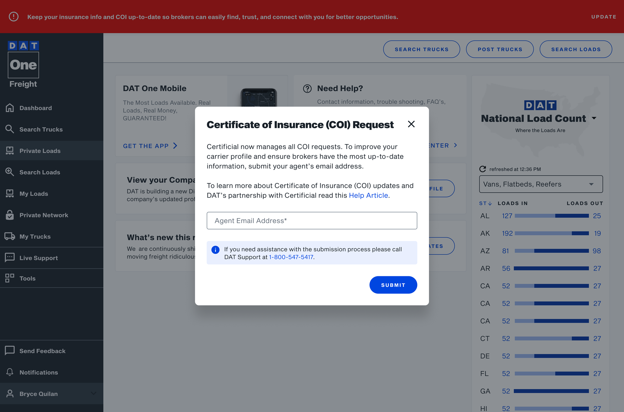 - Ask your agent to respond promptly to Certificial’s request. Once your agent submits the information, your DAT insurance record will update automatically.