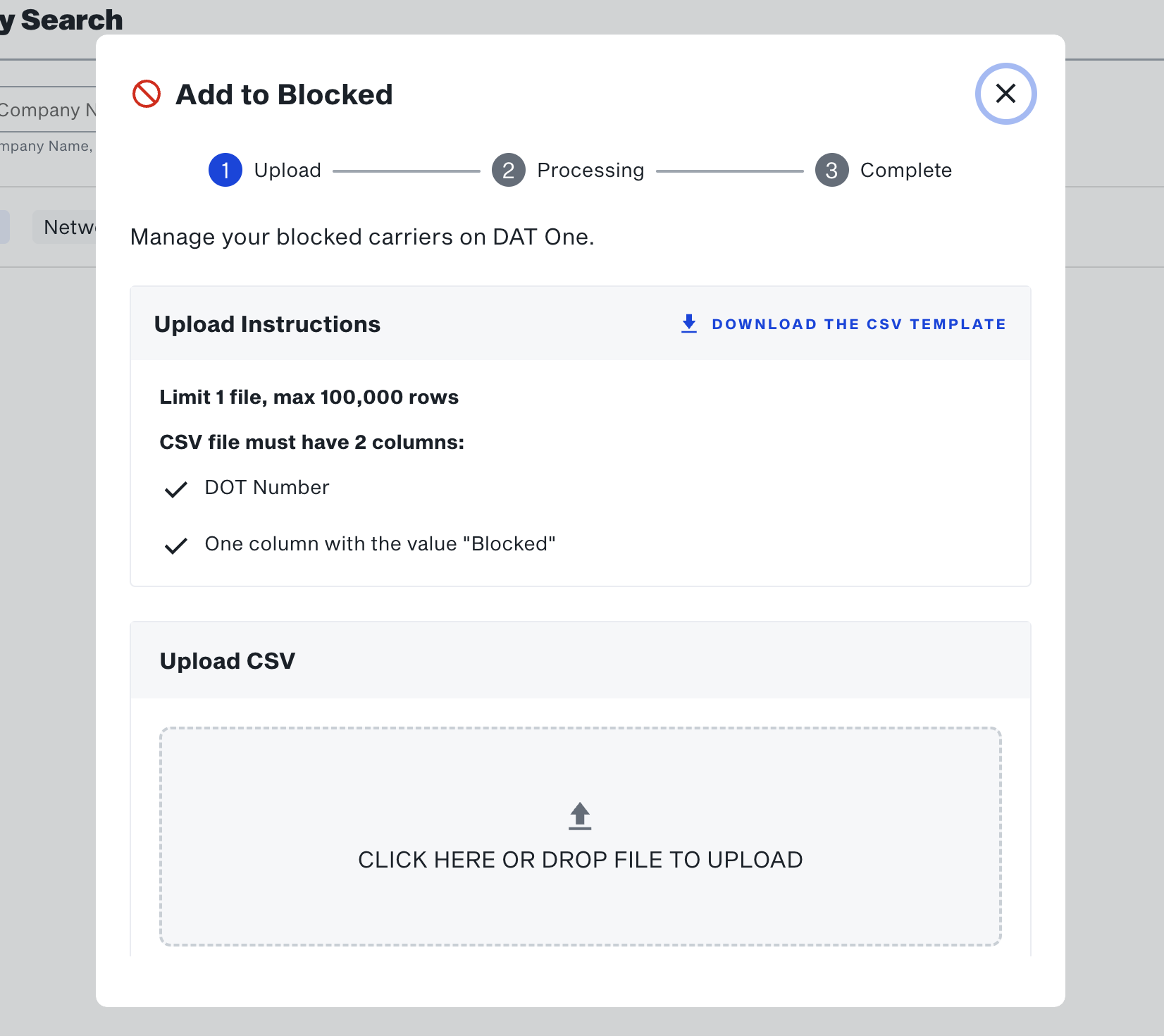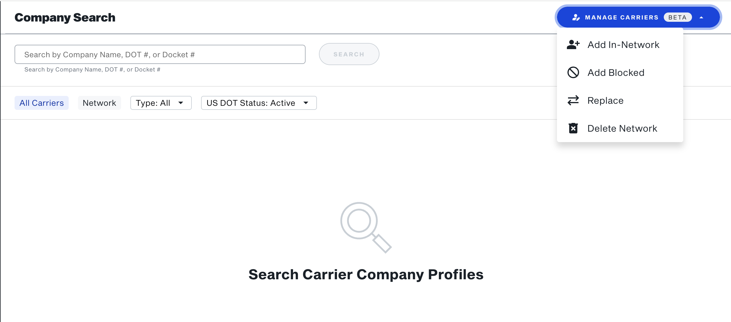 You can manage your carrier network through a CSV upload in the Company Search experience.