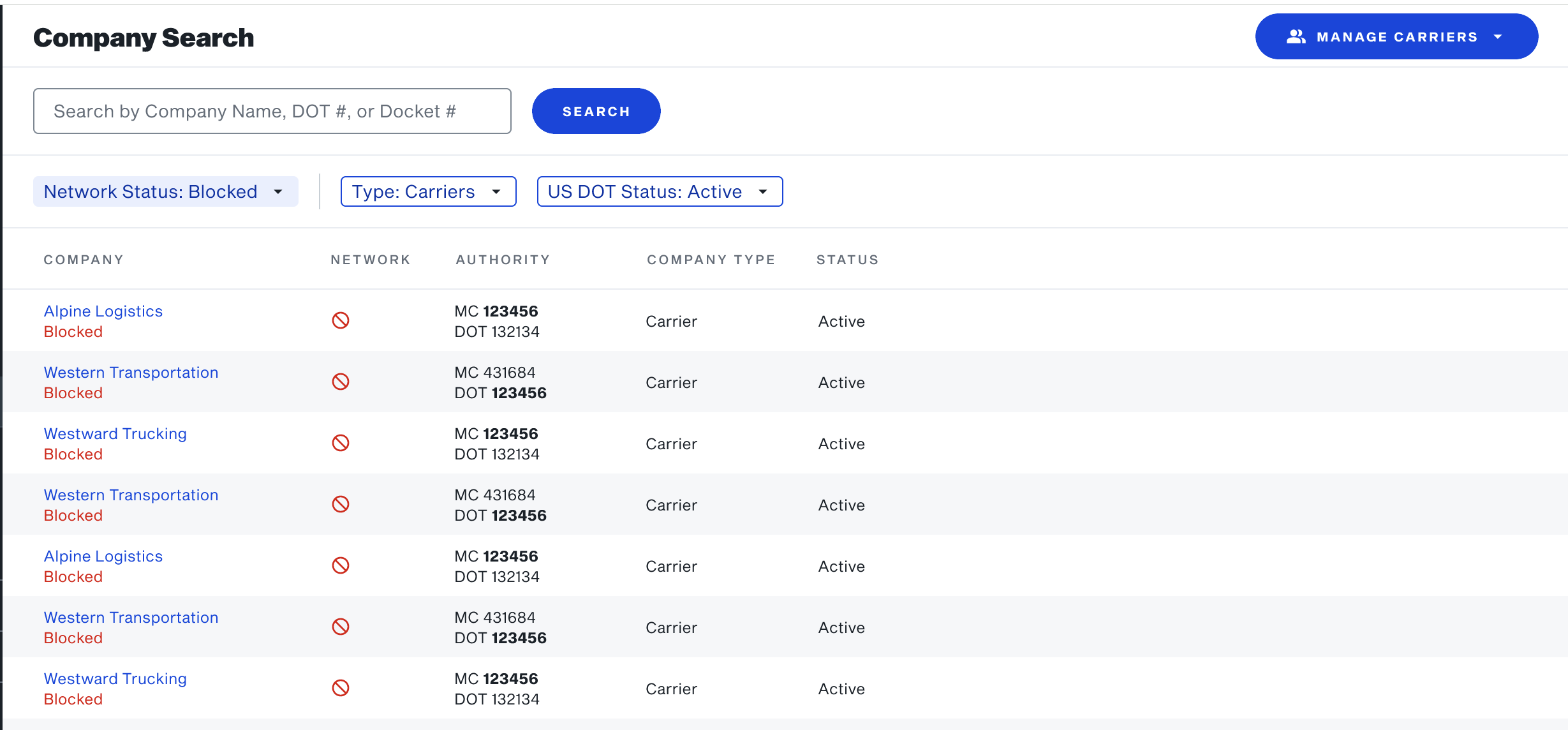 - When searching for a specific DOT, an “In Network” icon will appear next to carriers that belong to your network. Carriers marked as Blocked will display a Blocked icon.