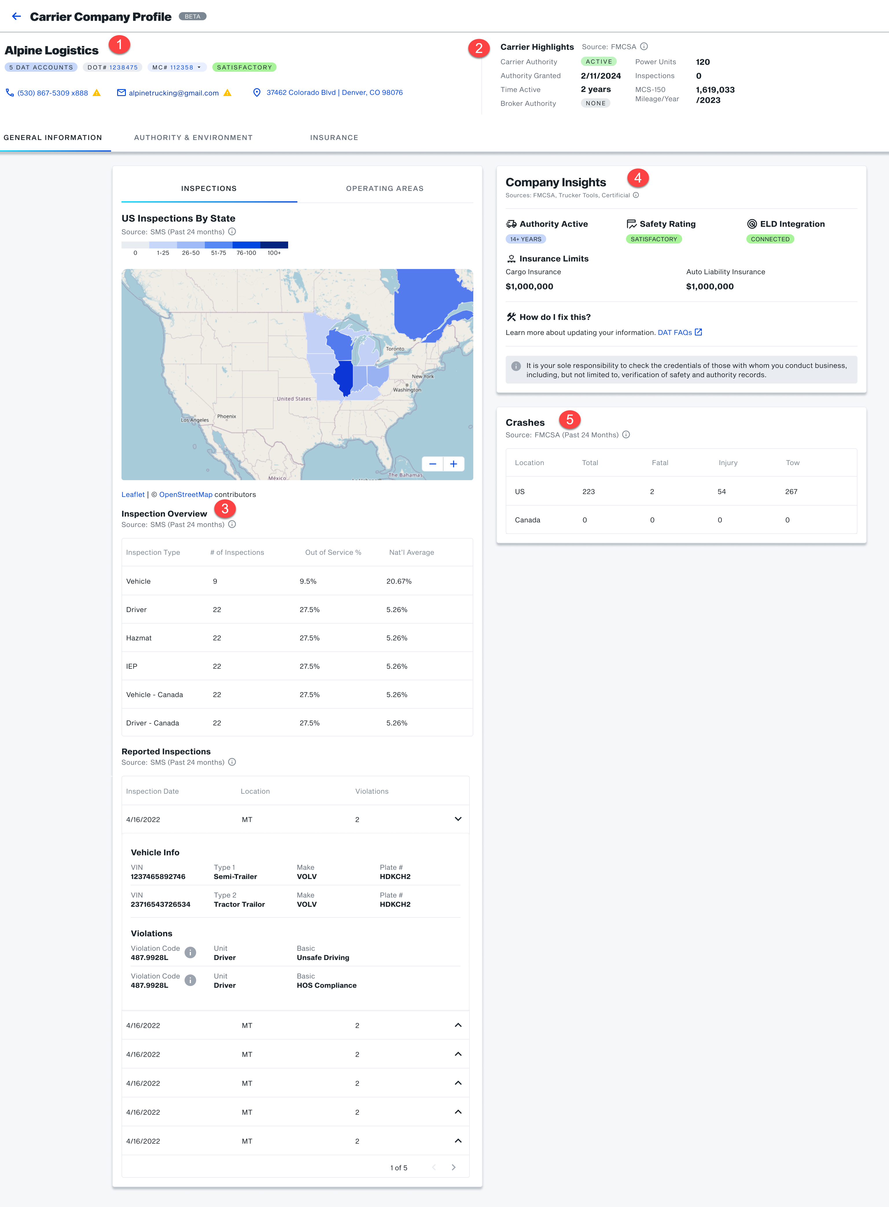 - Definition: Displays key carrier information, including authority status, safety rating, ELD integration status, and insurance coverage limits (cargo and auto liability).