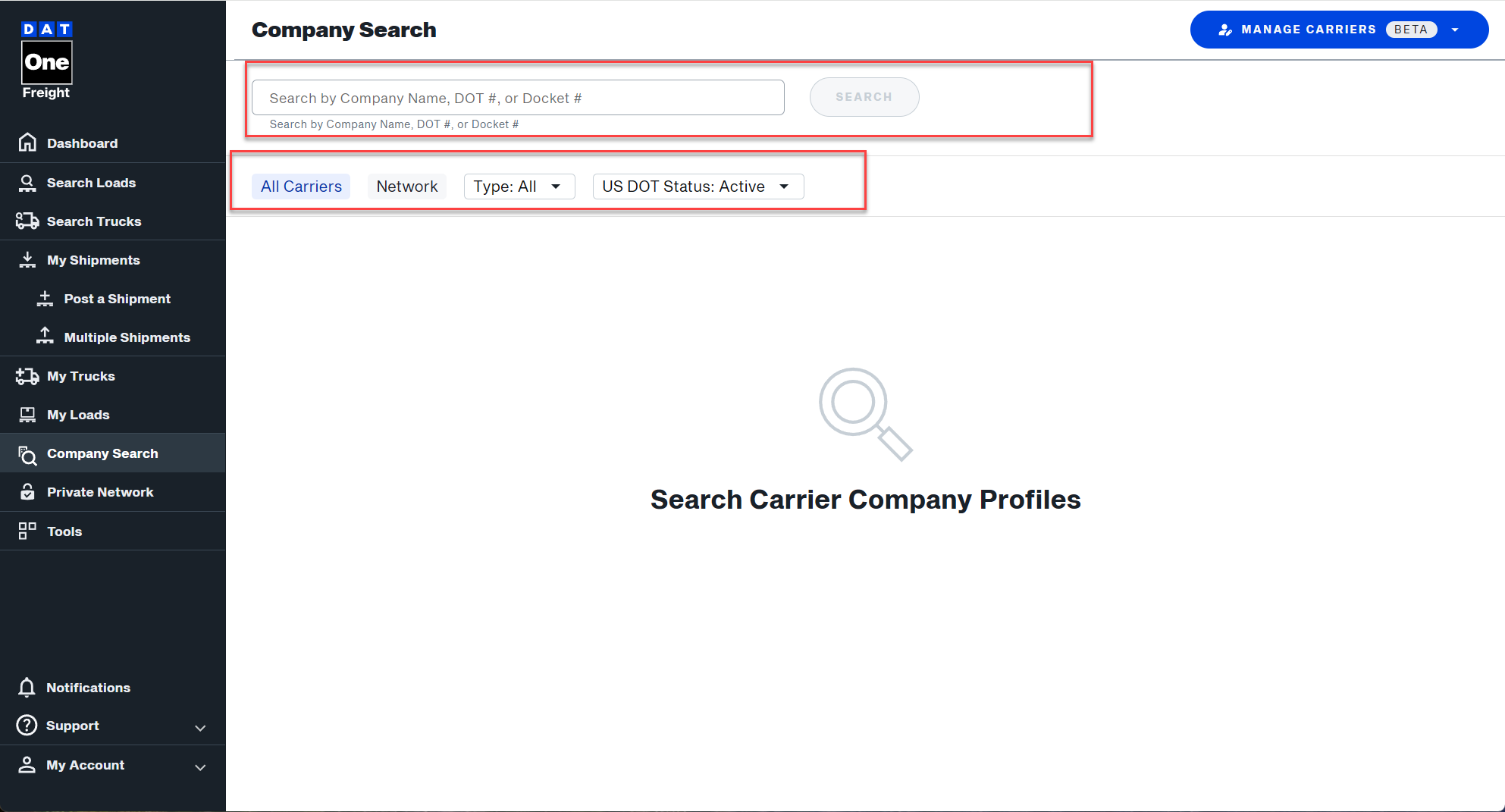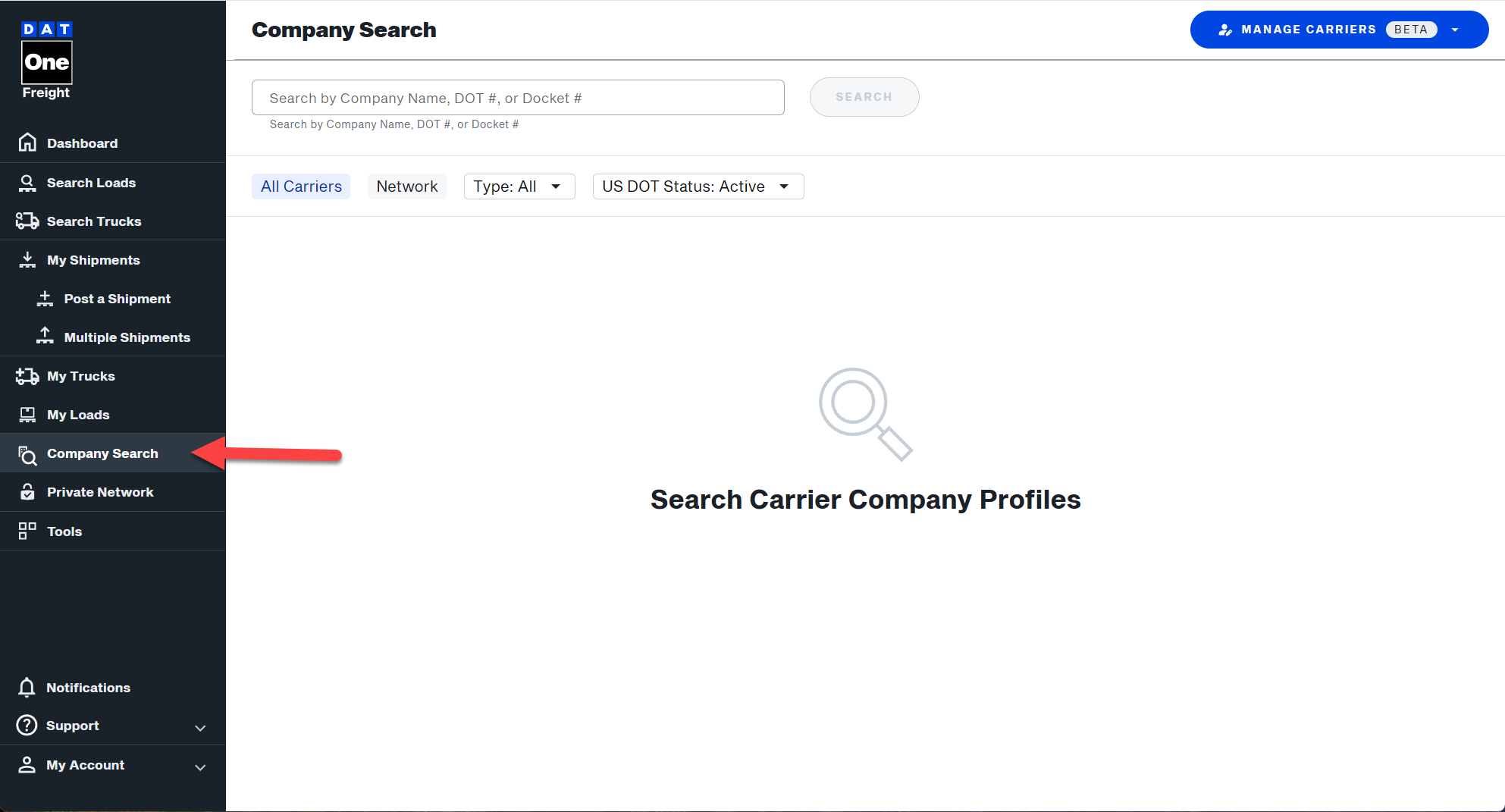 - In the Search box enter the company you are looking for (eg. company name, MC#, DOT#, FF#, etc) and click the Magnifying Glass.
