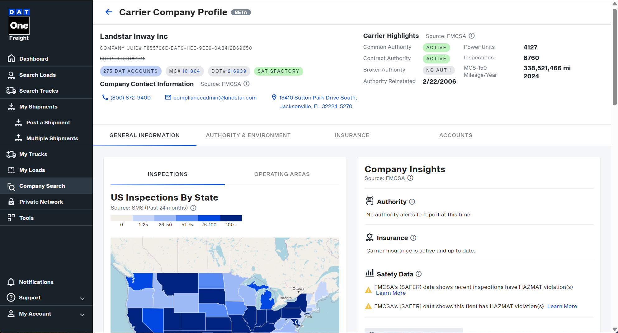 - Company profiles include DOT-level contact details and display all associated dockets in the header.