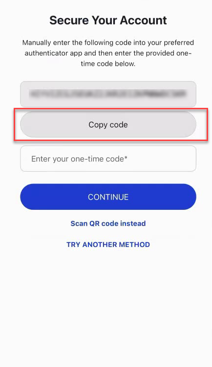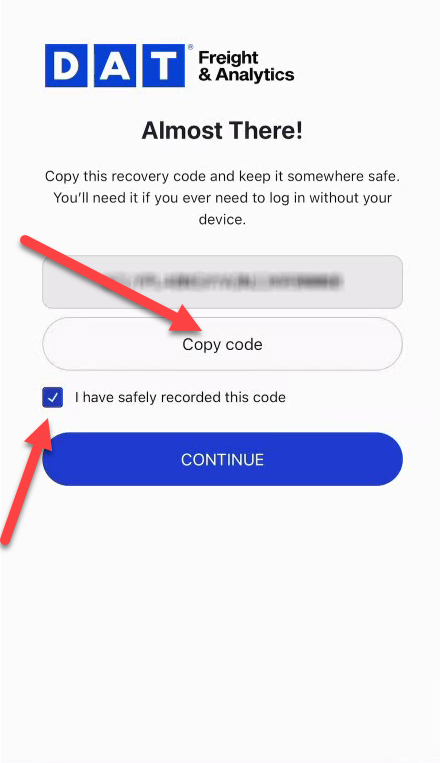 Click Copy Code, put a checkmarkm next to I have safely recorded this code, and click CONTINUE.