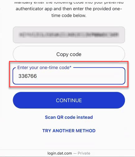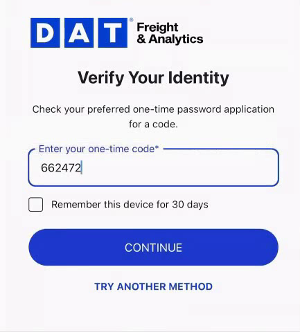 - In DAT One's login screen, enter the 6-digit code from Google Authenticator. Tap CONTINUE.