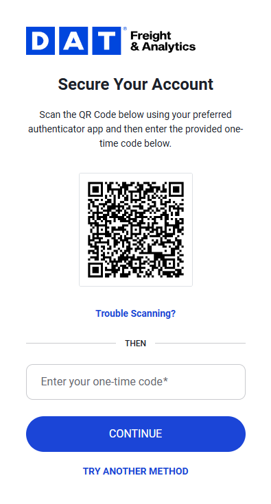 When you sign up or MFA Is reset, You’ll be prompted to set up multi-factor authentication (MFA) on DAT One Web or DAT One Mobile.