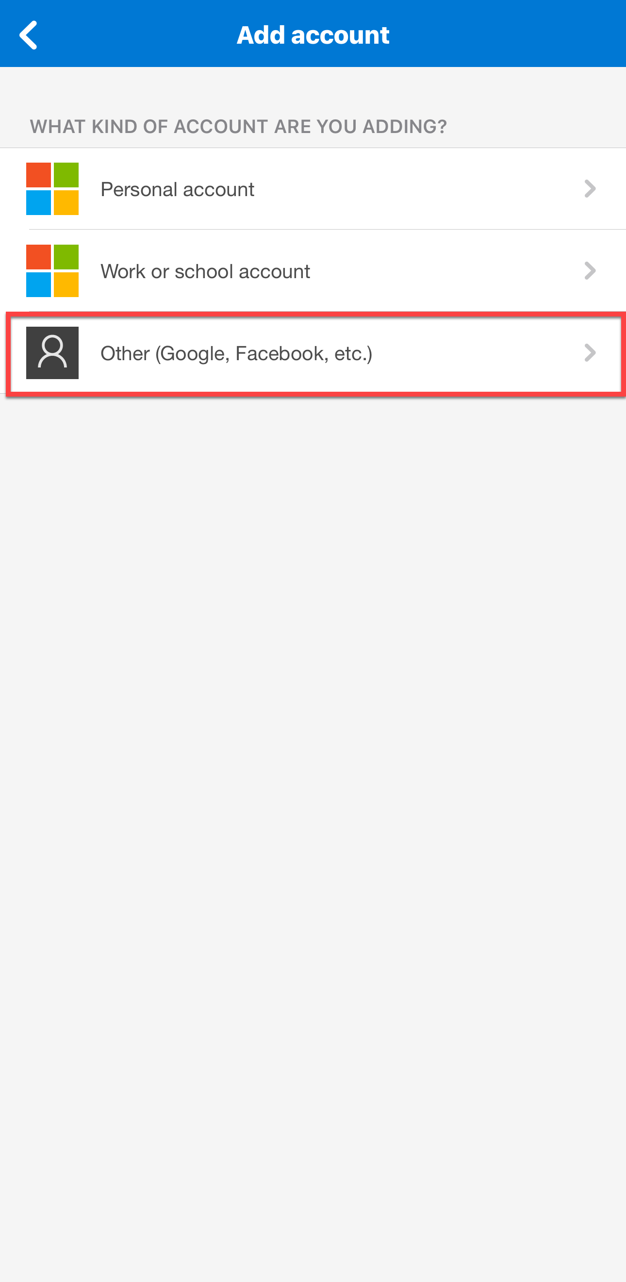 - Select Work or school account or Other account.