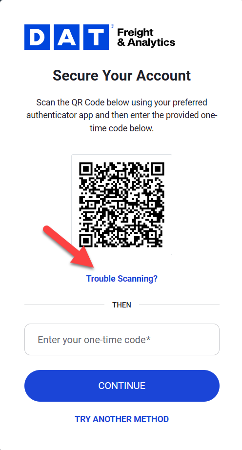 When you sign up or your MFA is reset, you will be prompted to set up multi-factor authentication (MFA) in DAT One Web or DAT One Mobile.