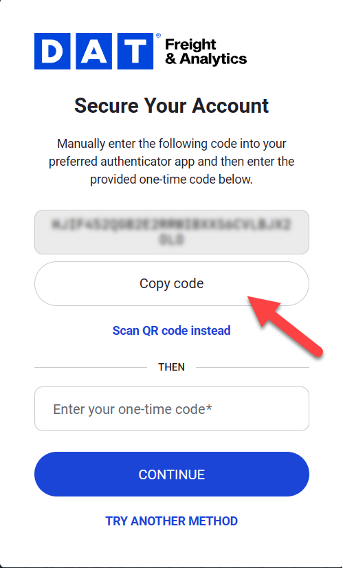 - Enter the code in DAT One and click CONTINUE.