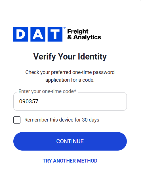After MFA is configured, each time you log in to DAT One Web or DAT One Mobile: